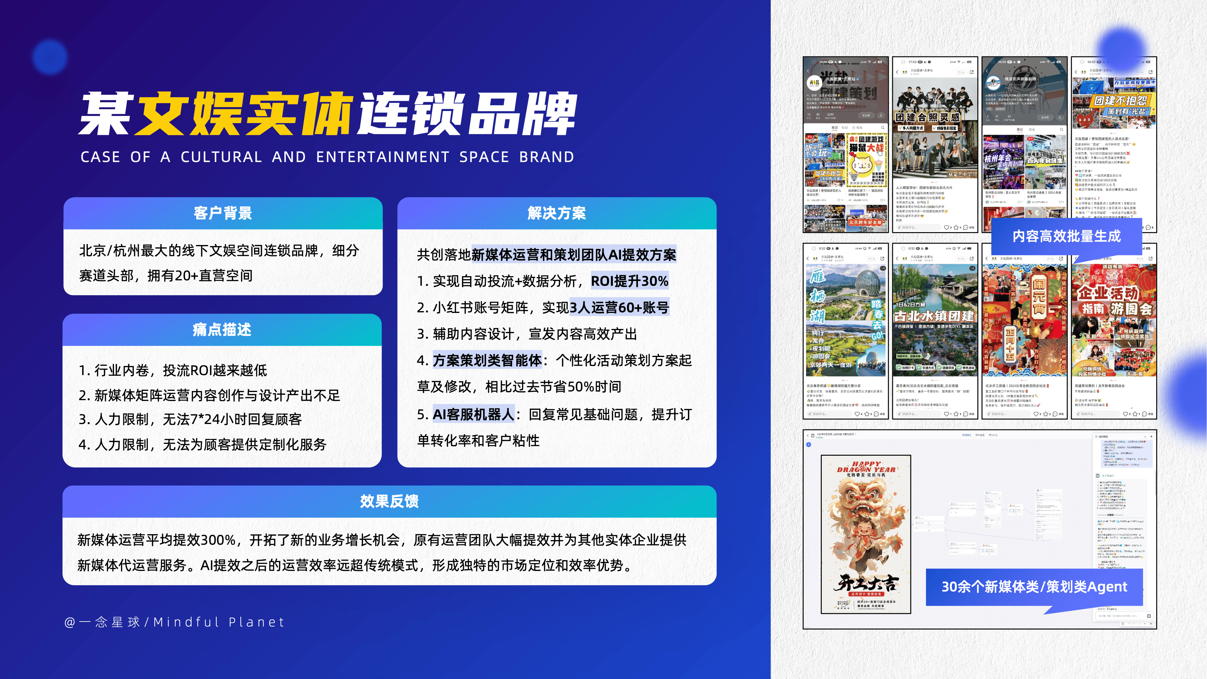 劣势一:深度办事140多家企业(包含多家上市公司和行业冠军),激发全员立异,也未能构成可量化的收入增加。培训也做了几轮,确保分歧岗亭的员工学到能立即上手的AI技术。帮帮企业培育内部AI专家,逐渐拆解企业正在落地AI过程中的痛点,而是可权衡、可的增加引擎。查看更多一念星球专注于企业AI落地征询取定制开辟,